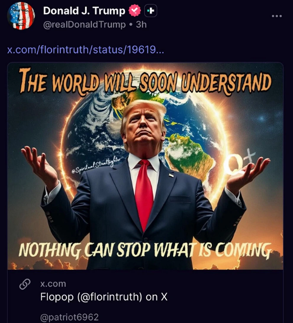Στην ανάρτησή του παρέθεσε έναν σύνδεσμο που παραπέμπει σε δημοσίευση τρίτου. Η δημοσίευση περιέχει μια φωτογραφία του ίδιου του Τραμπ με τα χέρια υψωμένα, ενώ στο φόντο διακρίνεται μια υδρόγειος σφαίρα.