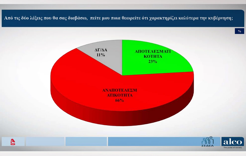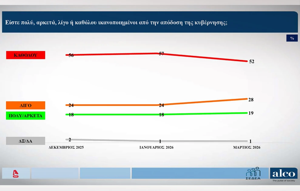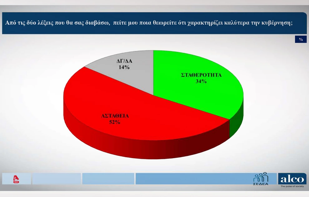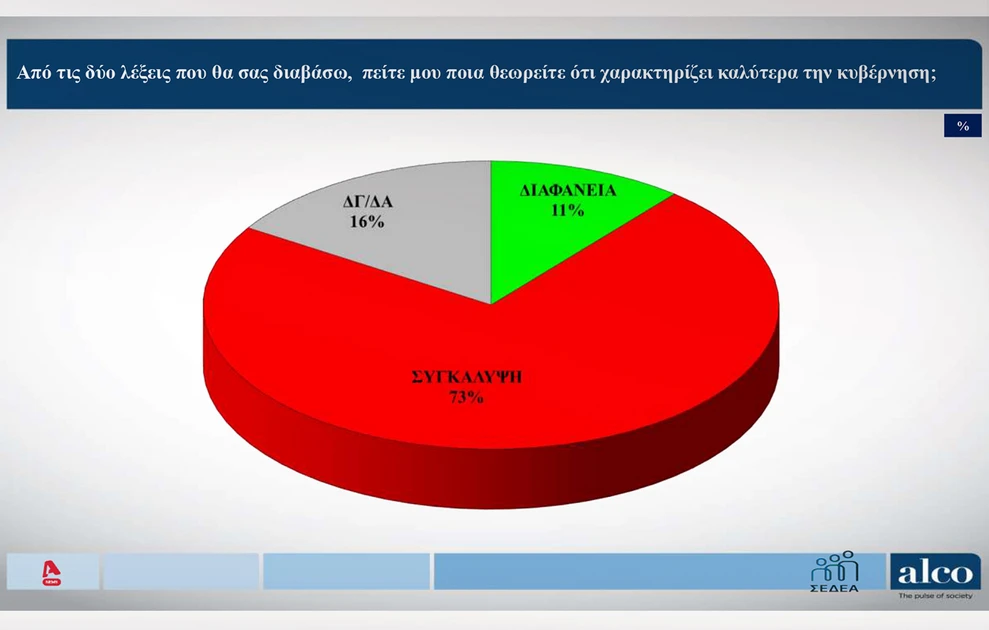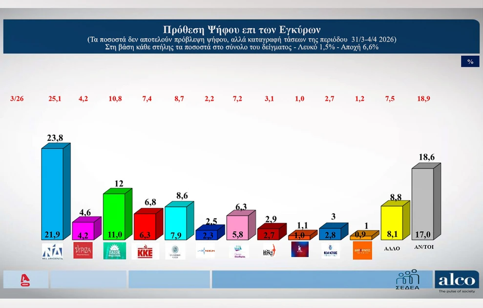 Η Alco πραγματοποίησε νέα δημοσκόπηση για τον Alpha, με τα ευρήματα να δείχνουν ότι η Νέα Δημοκρατία προηγείται με 11,8 μονάδες διαφορά από το ΠΑΣΟΚ, ενώ αποτυπώνεται και η απήχηση της Μαρίας Καρυστιανού από τη στιγμή που ανακοίνωσε το κόμμα της.