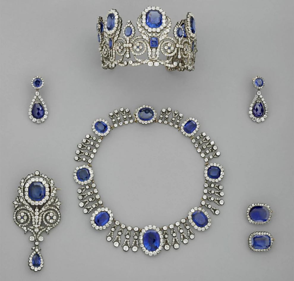 Μια τιάρα, ένα κολιέ και ένα μονό σκουλαρίκι από το σετ με ζαφείρια που ανήκε στη βασίλισσα Μαρία-Αμαλία και στη βασίλισσα Ορτάνς.