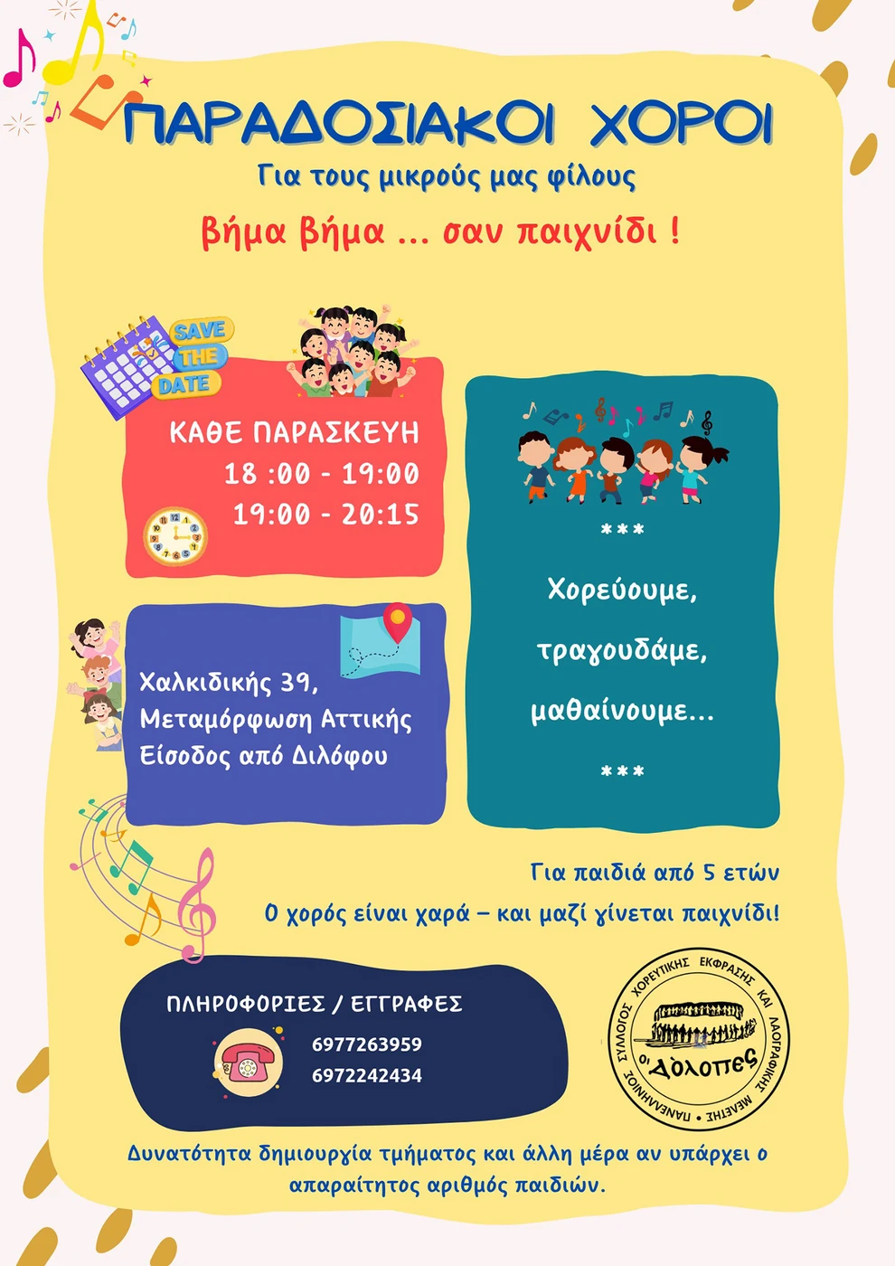 Ο Σύλλογος ΟΙ ΔΟΛΟΠΕΣ προσκαλεί σε ένα ανοιχτό δοκιμαστικό μάθημα χορού για παιδιά.
