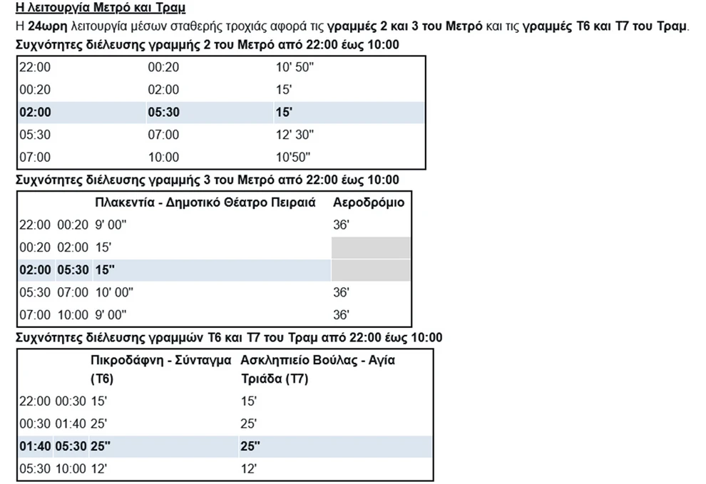 Η 24ωρη λειτουργία μέσων σταθερής τροχιάς αφορά τις γραμμές 2 και 3 του Μετρό και τις γραμμές Τ6 και Τ7 του Τραμ.