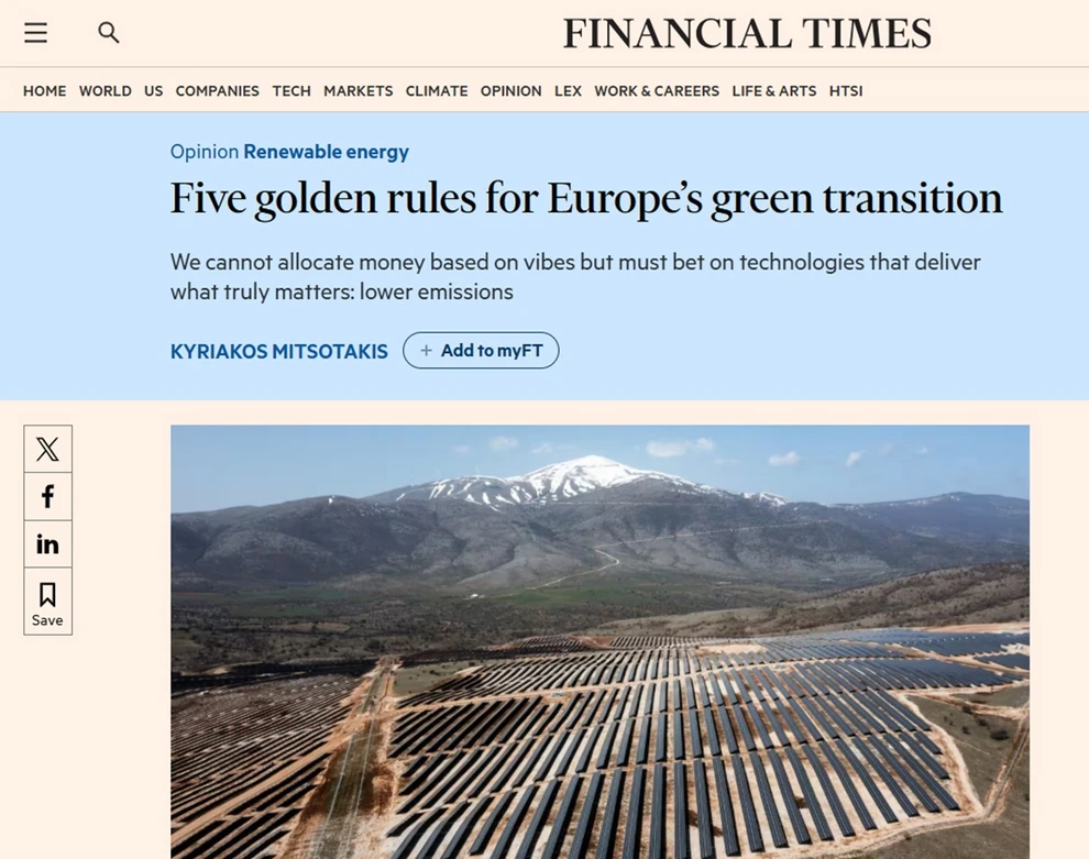 Στο άρθρο του στους Financial Times, ο πρωθυπουργός επισημαίνει: «Η Πράσινη Συμφωνία της ΕΕ βρίσκεται σε σταυροδρόμι. Οι υψηλές τιμές ενέργειας αφήνουν λίγα περιθώρια να επιβαρύνουμε τις οικονομίες μας με πρόσθετα κόστη. Παράλληλα, το νέο γεωπολιτικό περιβάλλον έχει μειώσει την όρεξη της Ευρώπης να αναπτύξει νέες εξαρτήσεις από καύσιμα, μέταλλα ή τεχνολογίες. Και η ΕΕ αντιμετωπίζει πλήθος άλλων προκλήσεων -η ενεργειακή μας μετάβαση πρέπει να ενισχύσει ένα ευρύτερο στρατηγικό πλαίσιο για το πού θέλει να βρίσκεται η Ευρώπη στον κόσμο».