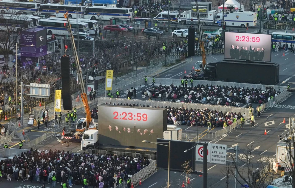 Περίπου 260.000 άνθρωποι αναμένεται να παρακολουθήσουν τη συναυλία των επτά σταρ της K-pop -RM, Jin, Suga, J-Hope, Jimin, V και Jung Kook- που θα εμφανιστούν μαζί για πρώτη φορά από τον Οκτώβριο του 2022, όταν σταμάτησαν τις κοινές εμφανίσεις λόγω των στρατιωτικών τους υποχρεώσεων.