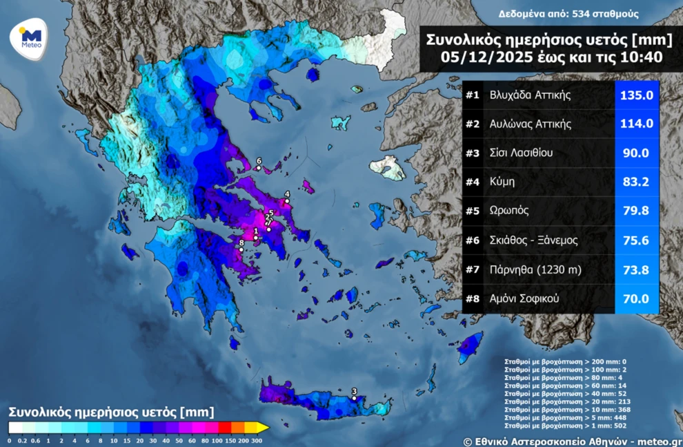 Επίσης, το meteo.gr του Εθνικού Αστεροσκοπείου σημείωσε ότι πολύ μεγάλα ύψη βροχής καταγράφηκαν από τις πρώτες πρωινές ώρες της Παρασκευής 05/12 στην Αττική, την Κρήτη, την Εύβοια και τις Σποράδες.