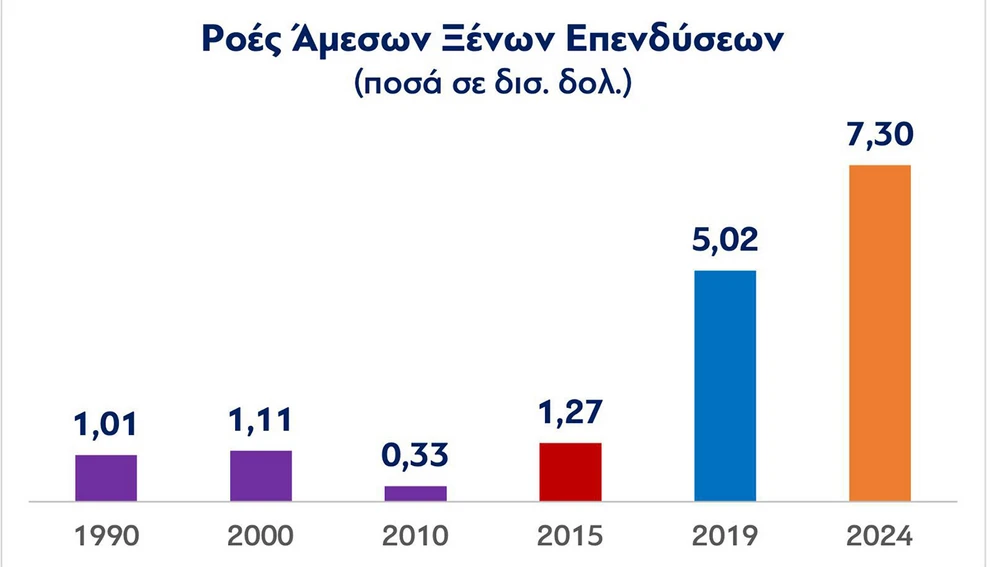 Συγκεκριμένα, «σύμφωνα με την UNCTAD (Οργανισμός Εμπορίου και Ανάπτυξης του ΟΗΕ), η Ελλάδα το 2024 κατέγραψε την 2η καλύτερη επίδοση, από το 1990, στις Άμεσες Ξένες Επενδύσεις (η καλύτερη είχε καταγραφεί το 2022). Οι ροές Άμεσων Ξένων Επενδύσεων άγγιξαν τα 7,3 δισ. δολάρια, καταγράφοντας αύξηση 41,5% σε σχέση με το 2023. Τα δε στοιχεία της Τράπεζας της Ελλάδος δείχνουν ότι η θετική αυτή πορεία συνεχίζεται και το α’ τρίμηνο του 2025».