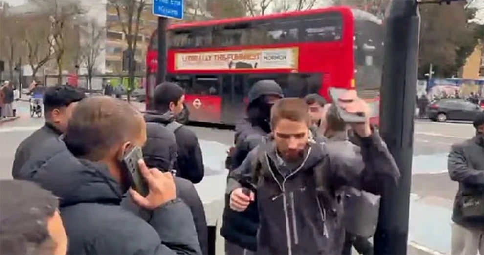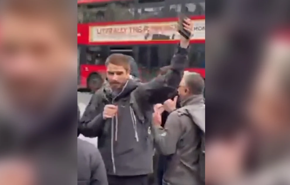 Μέρος του εξοπλισμού του δέχεται επίθεση με κλωτσιές από έναν άνδρα που φοράει γκρι φόρμα και ένα φουσκωτό παλτό, την ώρα που ένας άλλος φωνάζει με μανία προς τον ιεροκήρυκα ρωτώντας τον «από πού κατάγεσαι;». Όταν ο ιεροκήρυκας απαντά «από το Λονδίνο», ο δεύτερος άνδρας συνεχίζει να ουρλιάζει και να κάνει χειρονομίες με τα χέρια του, προτού ένας τρίτος μουσουλμάνος που φοράει μάσκα πλησιάσει τον ιεροκήρυκα από πίσω και τον σπρώχνει με δύναμη.