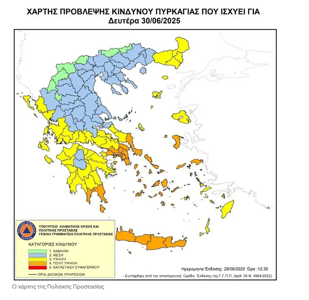 Σύμφωνα με τον χάρτη Πολιτικής Προστασίας, τη Δευτέρα ο κίνδυνος φωτιάς παραμένει πολύ υψηλός (κατηγορία κινδύνου 4) σε 10 περιοχές λόγω των δυνατών ανέμων.