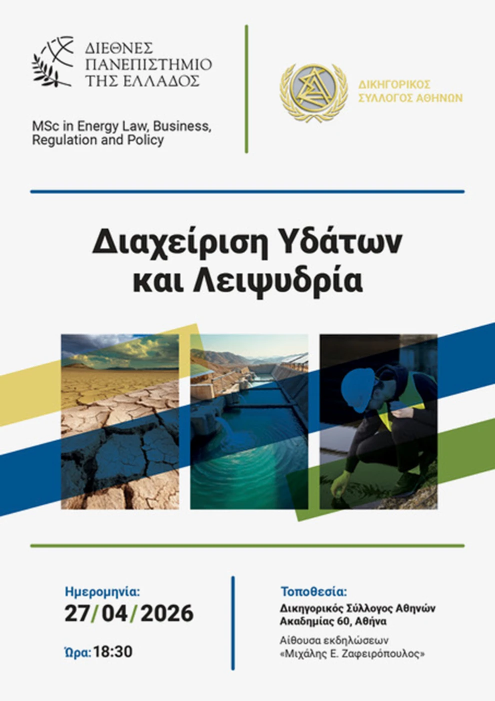 «Διαχείριση υδάτων και λειψυδρία» είναι το θέμα επιστημονικής εκδήλωσης που οργανώνεται από τον Δικηγορικό Σύλλογο Αθηνών και το Διεθνές Πανεπιστήμιο Ελλάδος. Η εκδήλωση θα διεξαχθεί τη Δευτέρα 27 Απριλίου 2026, στις 18:30, στον Δικηγορικό Σύλλογο Αθηνών και εισηγητές είναι οι πλέον έγκριτοι πανεπιστημιακοί του τομέα.
