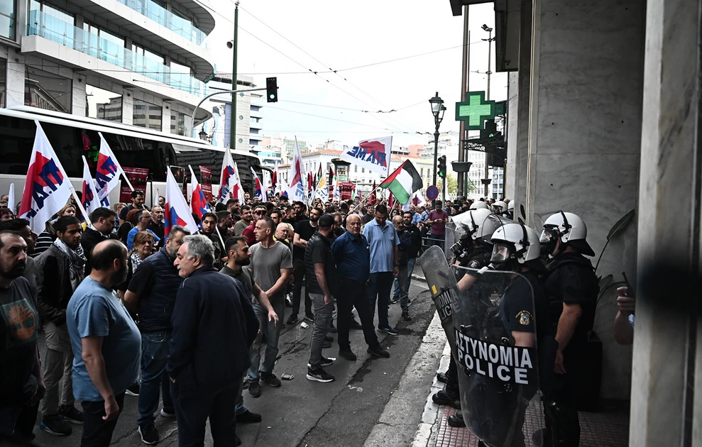 Συγκέντρωση διαμαρτυρίας έξω από ξενοδοχείο στην Ομόνοια όπου θα λάμβανε χώρα συνέδριο για την οικονομική συνεργασία Ελλάδας – Ισραήλ πραγματοποίησε το «ΠΑΜΕ».