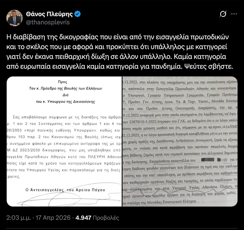 Ειδικότερα, ο κ. Πλεύρης έφερε στο φως της δημοσιότητας απόσπασμα της δικογραφίας που έφτασε στη Βουλή, η οποία, όπως φαίνεται από τα έγγραφα, αφορά μήνυση εις βάρος του για υπηρεσιακό ζήτημα, την περίοδο που κατείχε το θώκο του Υπουργού Υγείας. Τότε, υπάλληλος του υπουργείου κατέθεσε μήνυση προς τον υπουργό επειδή δεν άσκησε ποινική δίωξη σε άλλον υπάλληλο, όπως μαρτυρούν και τα έγγραφα που δημοσιεύει, διαψεύδοντας έτσι δημοσιεύματα που έκαναν λόγο για κατηγορία από την Ευρωπαϊκή Εισαγγελία για την περίοδο της Covid-19.
