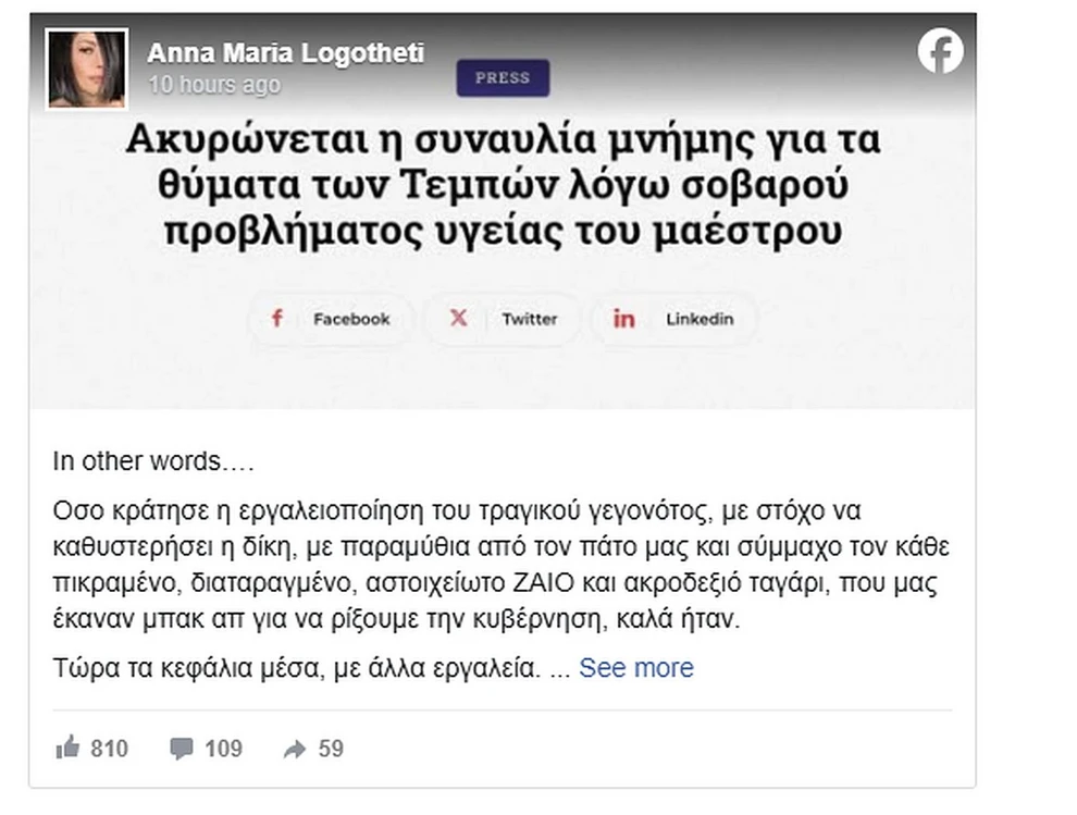 Μια ανάρτηση στο Facebook άναψε φωτιές όταν η Άννα Μαρία Λογοθέτη με αφορμή την ακύρωση της συναυλίας για τα Τέμπη, έκανε λόγο για εργαλειοποίηση του τραγικού γεγονότος.