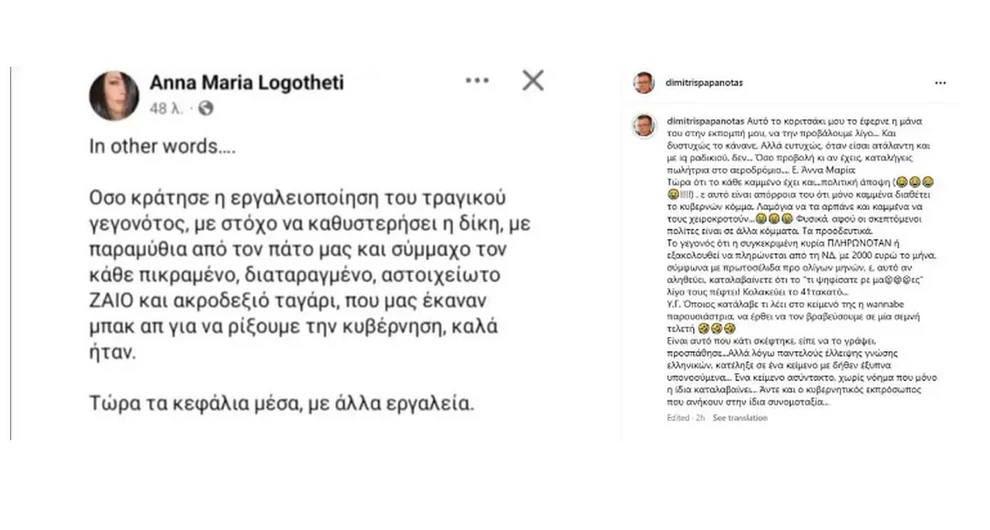 Με τη σειρά της, η Άννα Μαρία Λογοθέτη συνέχισε με μία νέα ανάρτηση στον δημόσιο διάλογο που ξέσπασε μεταξύ τους.
