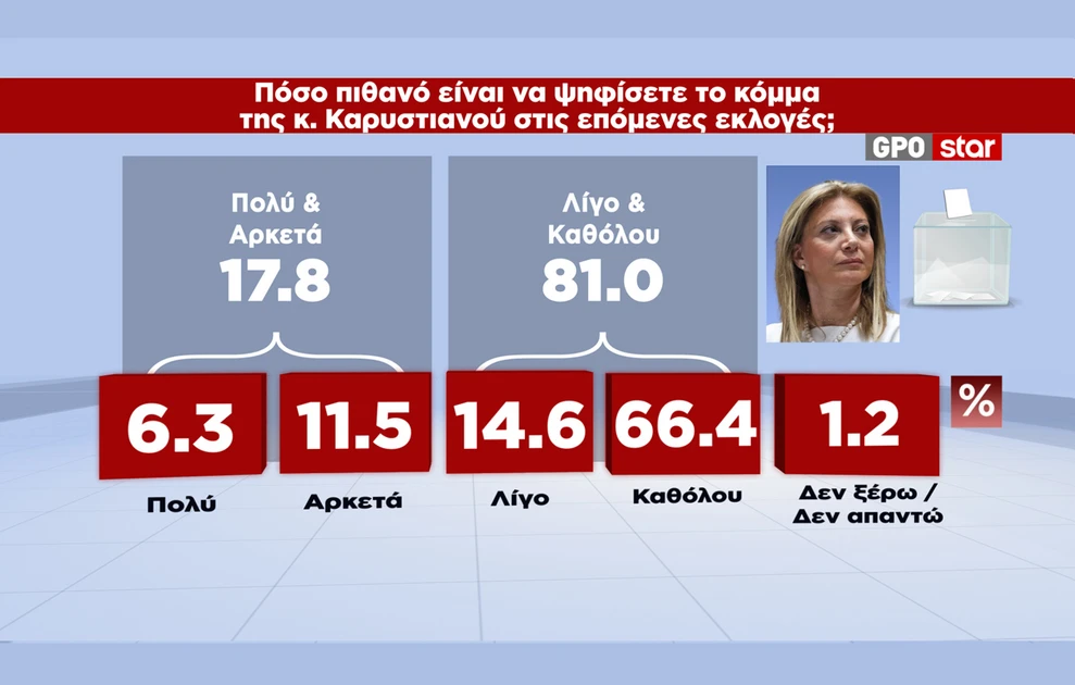 Στην ερώτηση πόσο πιθανό είναι να ψηφίσετε κόμμα της Μαρίας Καρυστιανού στις επόμενες εκλογές, οι συμμετέχοντες απάντησαν: