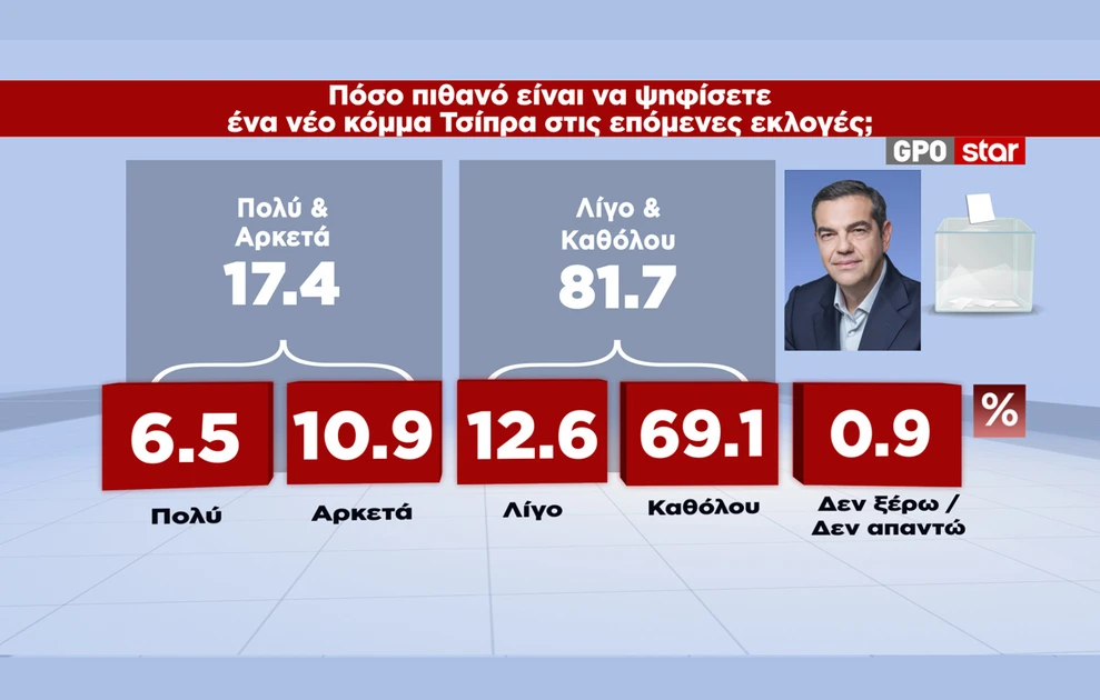Η δημοσκόπηση μεταξύ άλλων έθεσε και ερώτημα για την περίπτωση που ο πρώην πρωθυπουργός Αλέξης Τσίπρας συμμετέχει στις επόμενες εκλογές με δικό του κόμμα.