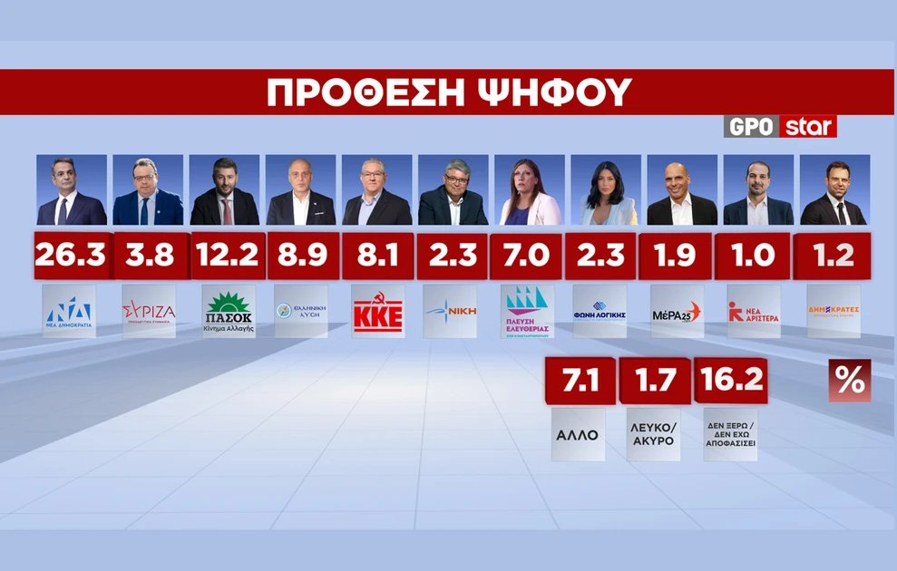 Δημοσκόπηση GPO: Πόση διαφορά έχουν Νέα Δημοκρατία και ΠΑΣΟΚ – Τα ποσοστά Τσίπρα και Καρυστιανού