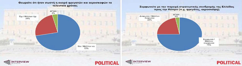 Αντίστοιχη είναι η εικόνα και στην επόμενη ερώτηση, αν συμφωνούν με την αγορά φρεγατών και αεροσκαφών τα τελευταία χρόνια, με το 72% να απαντά ναι/μάλλον ναι, το 24% όχι/μάλλον όχι και το 4% ΔΞ/ΔΑ.