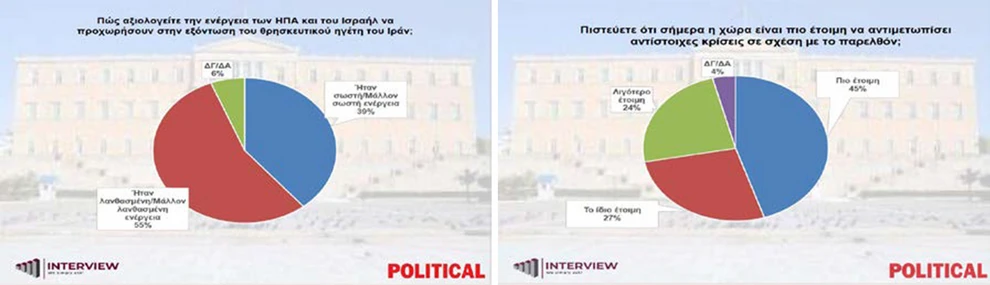 Ειδικότερα, στην ερώτηση «πώς αξιολογείτε την ενέργεια των ΗΠΑ και του Ισραήλ να προχωρήσουν στην εξόντωση του θρησκευτικού ηγέτη του Ιράν;», η πλειονότητα των ερωτηθέντων, σε ποσοστό 55%, τη θεωρεί λανθασμένη/μάλλον λανθασμένη, προφανώς, όπως προκύπτει από τις επόμενες απαντήσεις, όχι γιατί στηρίζει το θεοκρατικό καθεστώς της Τεχεράνης, αλλά διότι φοβάται τις οικονομικές συνέπειες και το «φρένο» στην αναπτυξιακή πορεία της χώρας. Σωστή/μάλλον σωστή ενέργεια τη χαρακτηρίζει το 39% των πολιτών, ενώ ΔΞ/ΔΑ λέει το 6%.