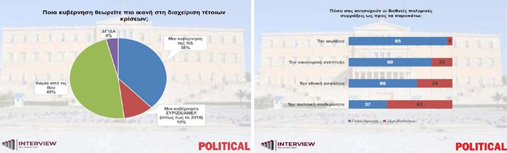 Στην ερώτηση αν πιστεύουν ότι η χώρα είναι πιο έτοιμη να αντιμετωπίσει αντίστοιχες κρίσεις σε σχέση με το παρελθόν, το 45% απαντά πιο έτοιμη, το 27% το ίδιο έτοιμη, το 24% λιγότερο έτοιμη και το 4% ΔΞ/ΔΑ. Στην ερώτηση «ποια κυβέρνηση θεωρείτε πιο ικανή στη διαχείριση τέτοιων κρίσεων;», το 38% απαντά μια κυβέρνηση της ΝΔ, το 10% μια κυβέρνηση ΣΥΡΙΖΑ-ΑΝΕΛ (όπως το 2019), ενώ το 48% καμία από τις δύο και 4% ΔΞ/ΔΑ.