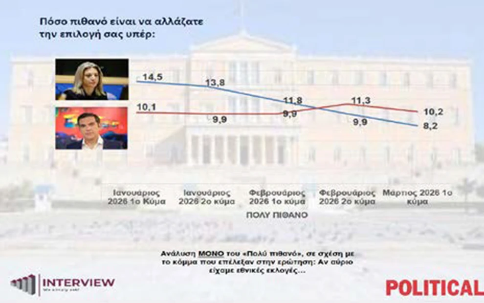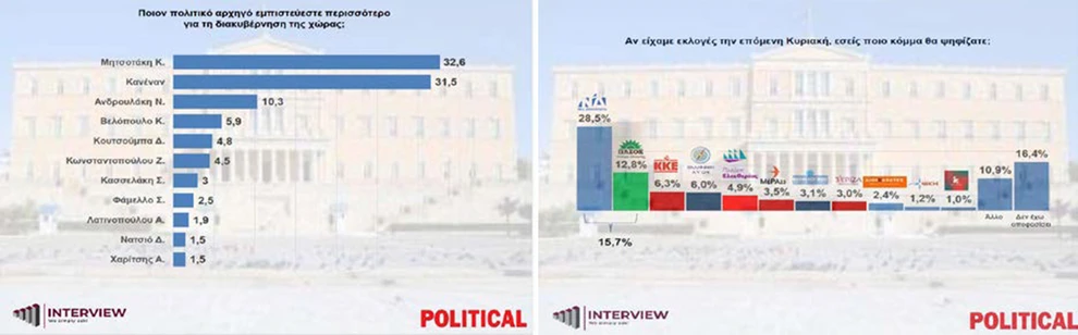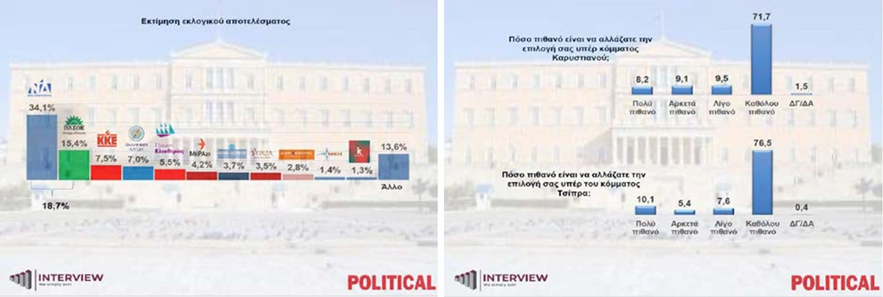 Δημοσκόπηση Interview: Στο 34,1% σκαρφαλώνει η Νέα Δημοκρατία, μεγαλώνει η ψαλίδα από το ΠΑΣΟΚ – «Ναι» σε άμυνα και ασφάλεια