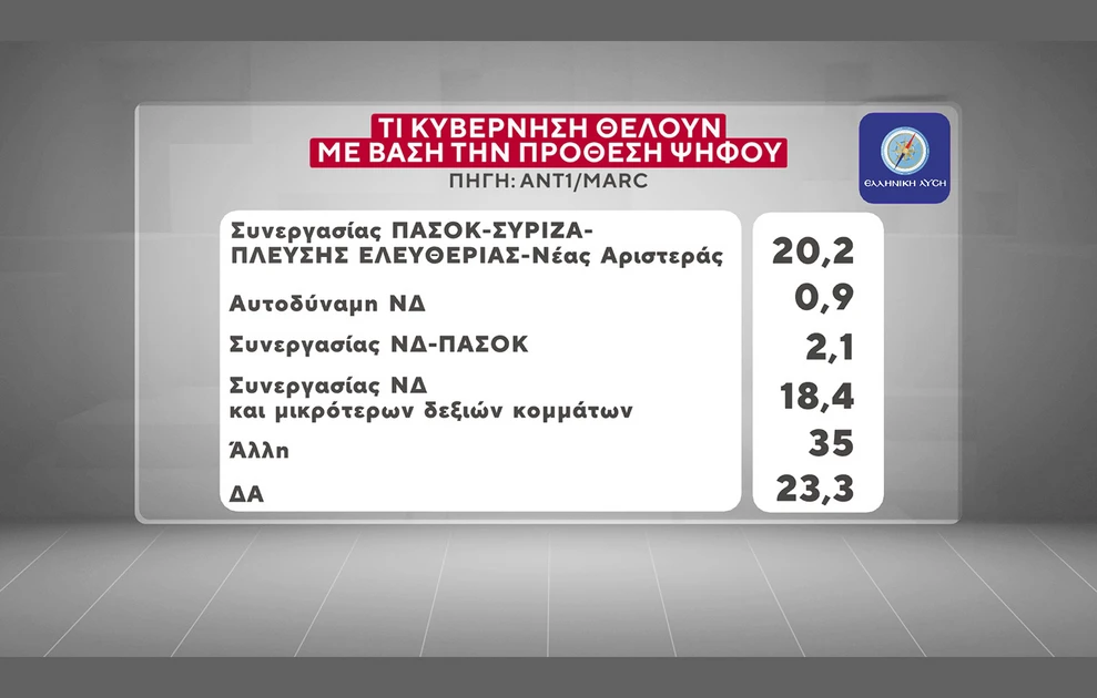 Κυβέρνηση «συνεργασίας Νέας Δημοκρατίας και μικρότερων δεξιών κομμάτων» θέλει το 9,3%, «άλλη» λέει το 12,7% και «Δεν απαντώ» το 15,1%. Μεγάλα ποσοστά στο «δεν απαντώ» καταγράφουν οι ψηφοφόροι της Ελληνικής Λύσης και του ΚΚΕ.