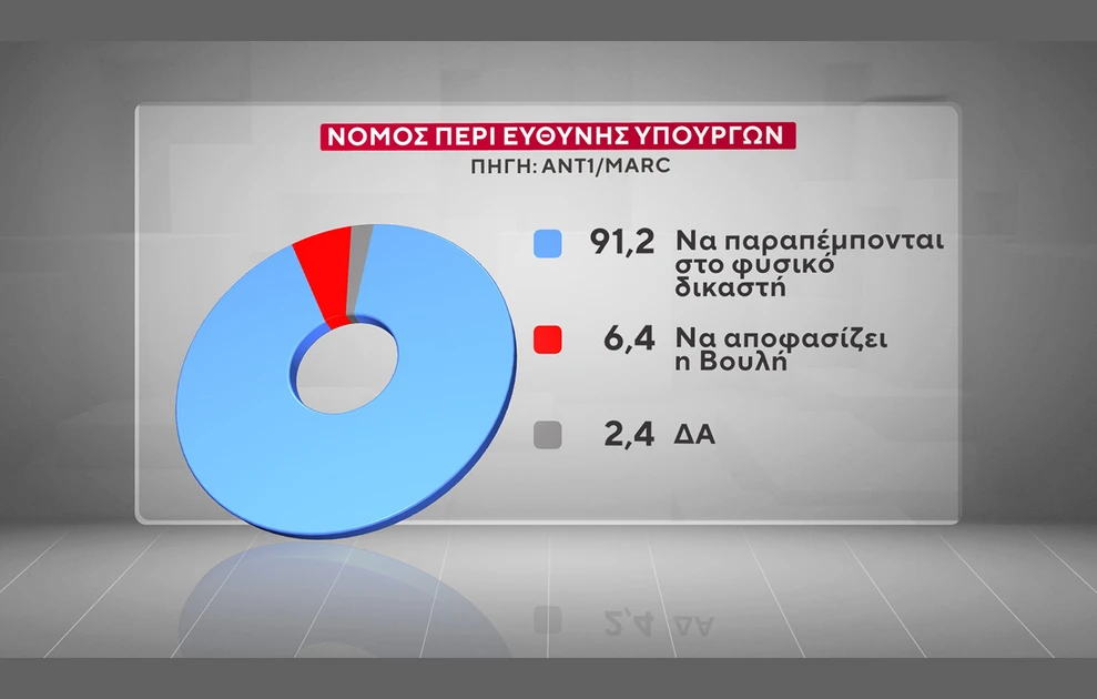 Συντριπτική είναι η πλειοψηφία και υπέρ της κατάργησης του νόμου περί ευθύνης υπουργών, καθώς το 91,2% απαντά πως οι υπουργοί πρέπει «να παραπέμπονται στον φυσικό δικαστή», ενώ μόλις 6,4% λέει πως «πρέπει να αποφασίζει η Βουλή».