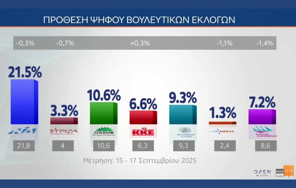 Στην πρόθεση ψήφου η Νέα Δημοκρατία προηγείται με διαφορά, ενώ τη δεύτερη θέση καταλαμβάνει το ΠΑΣΟΚ, αλλά κολλημένο σε ποσοστό 10,6%.