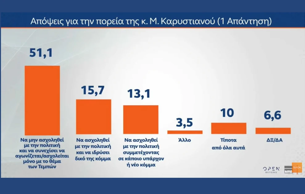 Το 51,1% πιστεύει ότι η Μαρία Καρυστιανού πρέπει να μην ασχοληθεί με τη πολιτική και να συνεχίσει να αγωνίζεται, ώστε να βρει δικαίωση για το νεκρό παιδί της.