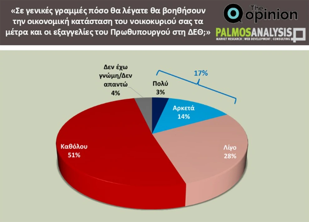Τέλος, αξίζει να σημειωθεί η έντονη επιφυλακτικότητα των πολιτών απέναντι στις εξαγγελίες της κυβέρνησης για την οικονομία. Στο ερώτημα κατά πόσο θεωρούν ότι τα μέτρα που ανακοινώθηκαν στη ΔΕΘ θα βοηθήσουν την οικονομική κατάσταση του νοικοκυριού τους, το 51% απάντησε «καθόλου», το 28% «λίγο», και μόλις το 17% «αρκετά» ή «πολύ».