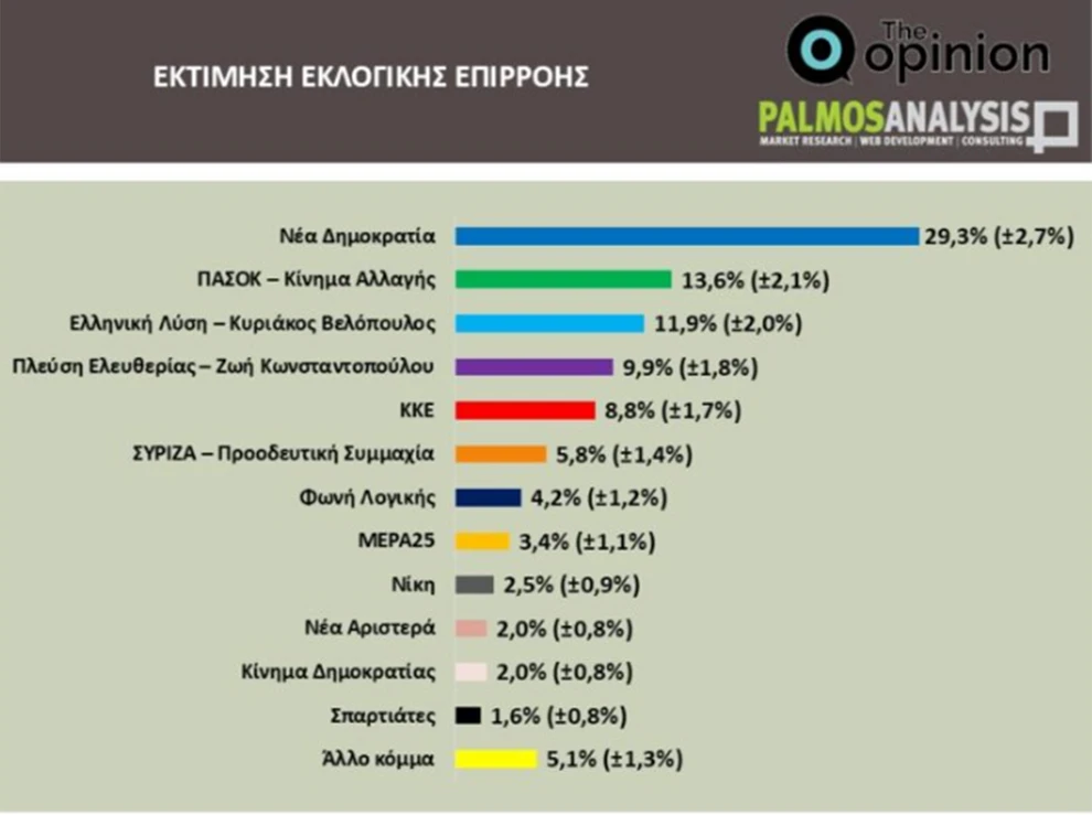 Σύμφωνα με τη δημοσκόπηση της Palmos Analysis για την ιστοσελίδα TheOpinion.gr, στην εκτίμηση εκλογικής επιρροής, η Νέα Δημοκρατία προηγείται με 29,3%, ενώ στην πρόθεση ψήφου συγκεντρώνει 22,6%. Ακολουθούν το ΠΑΣΟΚ (13,6% και 10,5% αντίστοιχα), η Ελληνική Λύση, η Πλεύση Ελευθερίας, το ΚΚΕ και με σαφώς μειωμένα ποσοστά ο ΣΥΡΙΖΑ. Ο πολιτικός χάρτης εμφανίζει έντονο κατακερματισμό, που επιτρέπει στη ΝΔ να διατηρεί διψήφια διαφορά, παρά τις απώλειες.