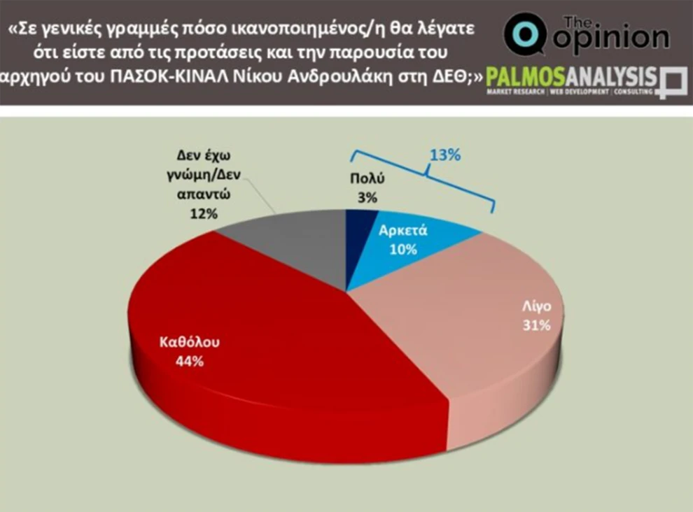 Το ΠΑΣΟΚ, παρά την κατάκτηση της δεύτερης θέσης, δεν φαίνεται ακόμη να πείθει ότι μπορεί να εξελιχθεί σε αξιόπιστο εναλλακτικό πόλο διακυβέρνησης. Η παρουσία του Νίκου Ανδρουλάκη στη ΔΕΘ προκάλεσε μερική αισιοδοξία, καθώς οι θετικές εκτιμήσεις υπερβαίνουν την τρέχουσα πρόθεση ψήφου του κόμματος. Ωστόσο, ακόμη και εντός της εκλογικής του βάσης, το 49% των ψηφοφόρων δηλώνει «λίγο» ή «καθόλου» ικανοποιημένο από την παρουσία και τις προτάσεις του αρχηγού, έναντι 42% που δηλώνει «πολύ» ή «αρκετά» ικανοποιημένο. Σε επίπεδο γενικού πληθυσμού, το 75% εκφράζεται αρνητικά, με μόλις το 13% να δηλώνει θετική εντύπωση.