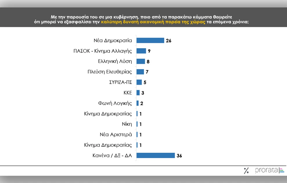 Σύμφωνα με την πρόθεση ψήφου, η ΝΔ διατηρεί την πρωτιά με 22,5% και δεύτερη είναι η παράταξη της Ζωής Κωνσταντοπούλου με 14%. Τρίτο έρχεται το ΠΑΣΟΚ με 12%, ενώ σε στενή απόσταση ακολουθεί η Ελληνική Λύση με 11,5%.