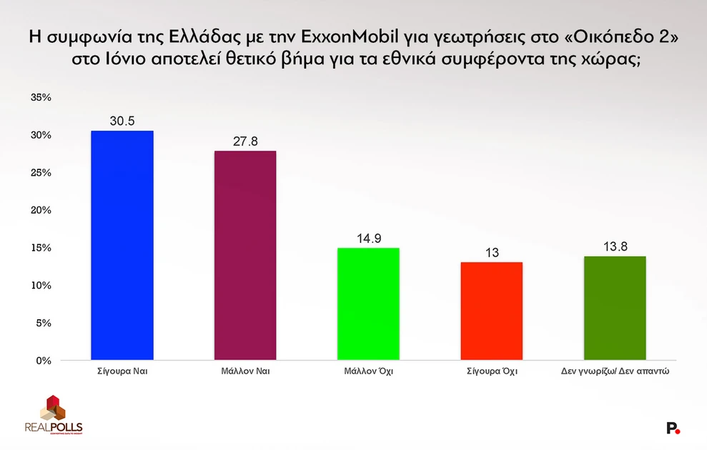 Η δημοσκόπηση της RealPolls ρώτησε μεταξύ άλλων τους πολίτες για τη γνώμη που έχουν για τη συμφωνία που υπεγράφη με την ExxonMobil, με το 58,3% (30,5% «σίγουρα ναι» και 27,8% «μάλλον ναι») να το θεωρεί θετική εξέλιξη.