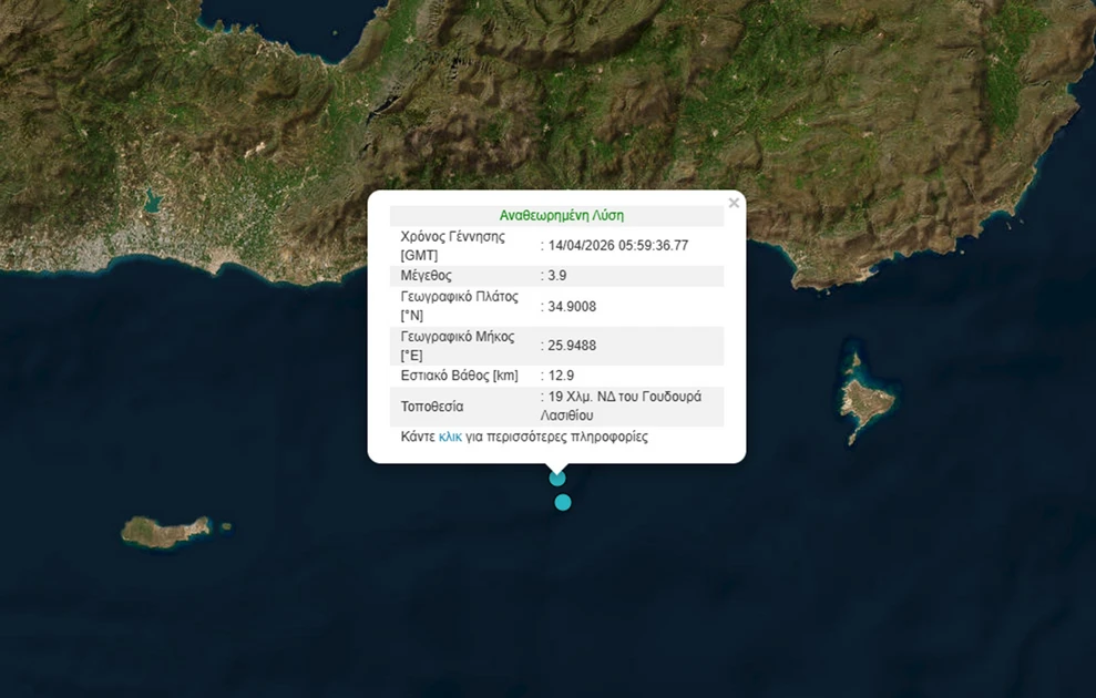 Διπλή σεισμική δόνηση σημειώθηκε νωρίς το πρωί της Τρίτης (14/04) σε θαλάσσια περιοχή ανοιχτά της Κρήτη και συγκεκριμένα στο Λασίθι.