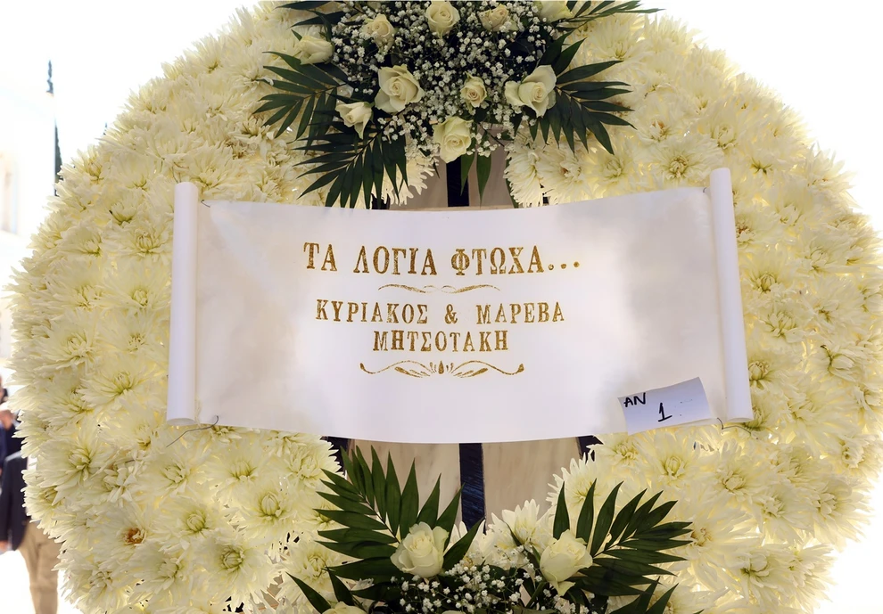 «Τα λόγια φτωχά…», είναι το μήνυμα στο στεφάνι του πρωθυπουργού, Κυριάκου Μητσοτάκη, και της συζύγου του, Μαρέβας Γκραμπόφσκι-Μητσοτάκη.