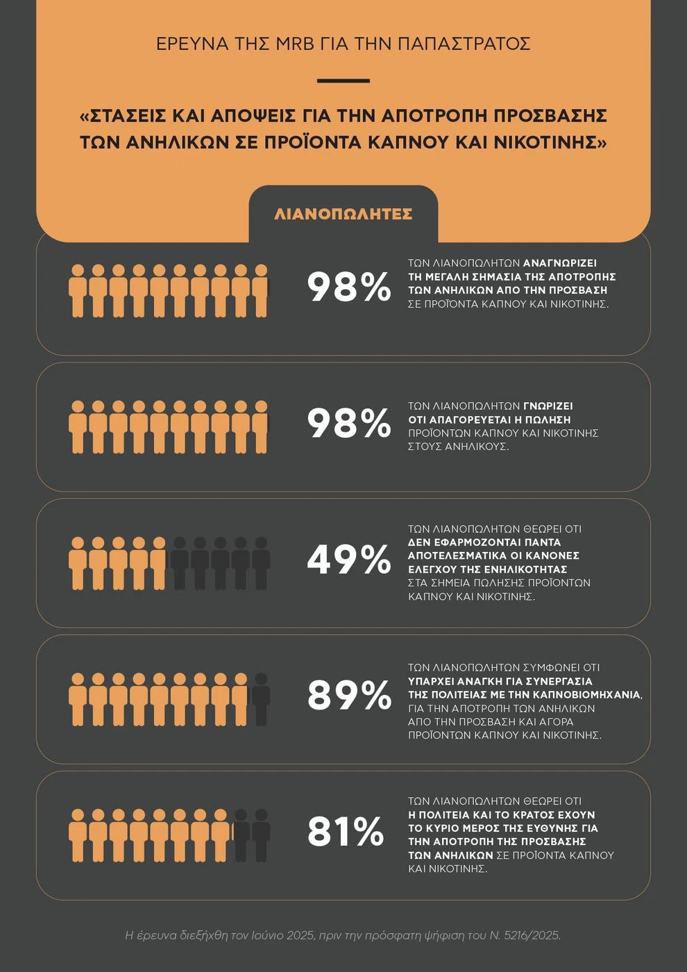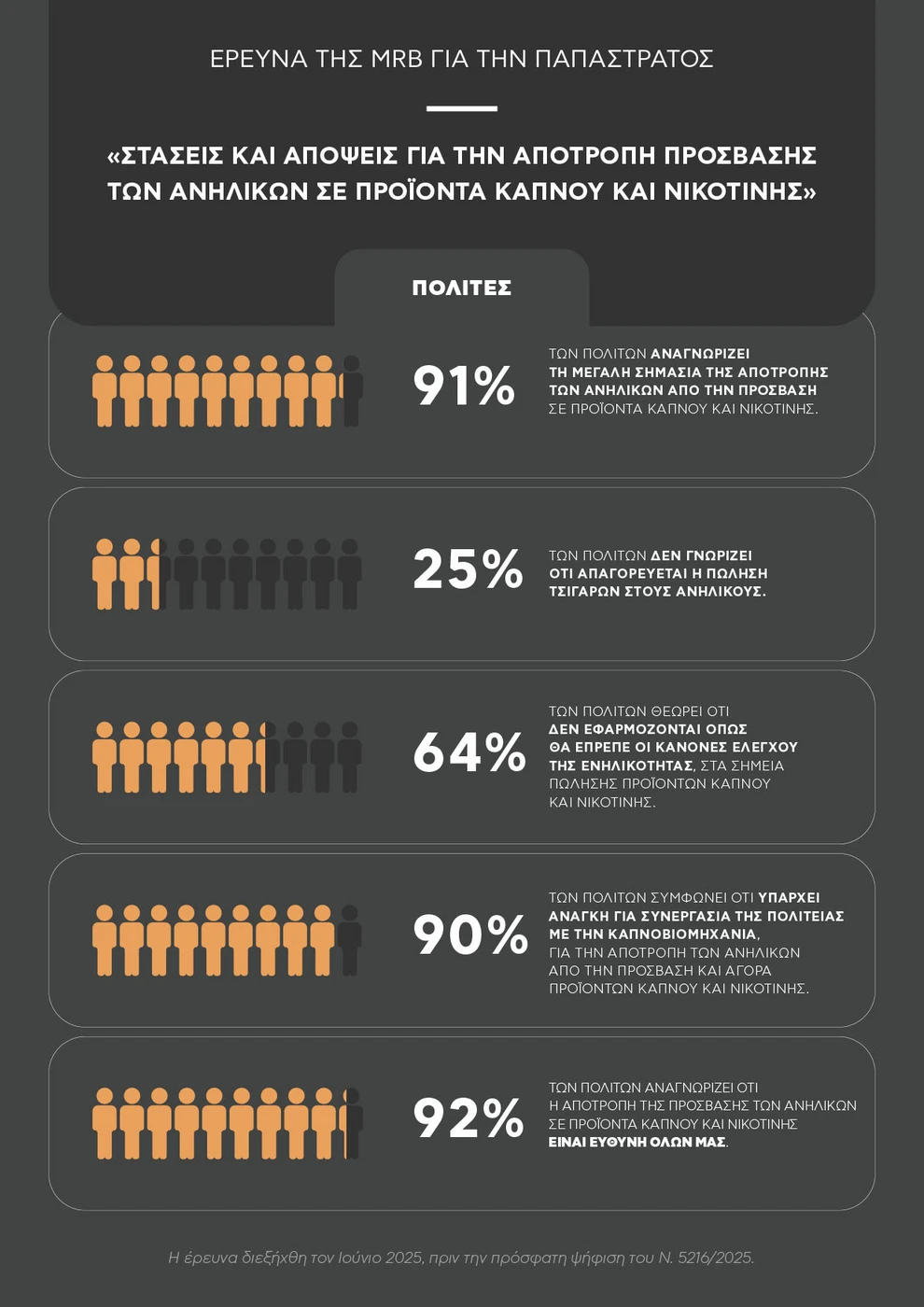Η έρευνα ανέδειξε ότι το φαινόμενο της κατανάλωσης προϊόντων καπνού και νικοτίνης από ανηλίκους είναι εκτεταμένο. Σχεδόν 8 στους 10 πολίτες (79,5%) πιστεύουν ότι οι ανήλικοι καπνίζουν παραδοσιακά τσιγάρα, ενώ 7 στους 10 (72,8%) θεωρούν διαδεδομένη τη χρήση ηλεκτρονικών τσιγάρων. Μάλιστα, 6 στους 10 δηλώνουν ότι το πρόβλημα επιδεινώνεται σε σχέση με το παρελθόν. Οι λιανοπωλητές αναγνωρίζουν επίσης το πρόβλημα, αν και σε πιο συγκρατημένα ποσοστά (44,3% για τα τσιγάρα και 53,3% για τα ηλεκτρονικά τσιγάρα).