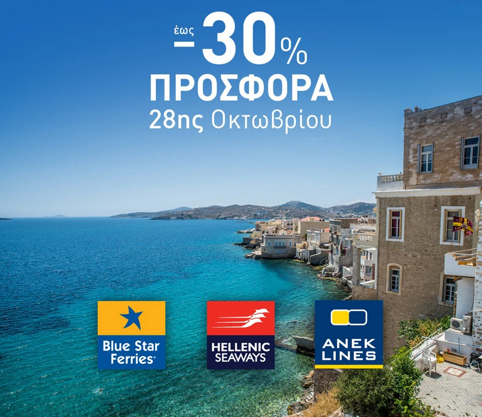 Οι εταιρείες Blue Star Ferries, Hellenic Seaways, ΑΝΕΚ Lines & Superfast Ferries, μέλη του Ομίλου Attica, προσφέρουν εκπτώσεις έως και 30% για τα δρομολόγια που θα εξυπηρετήσουν την φθινοπωρινή απόδραση της 28ης Οκτωβρίου.
