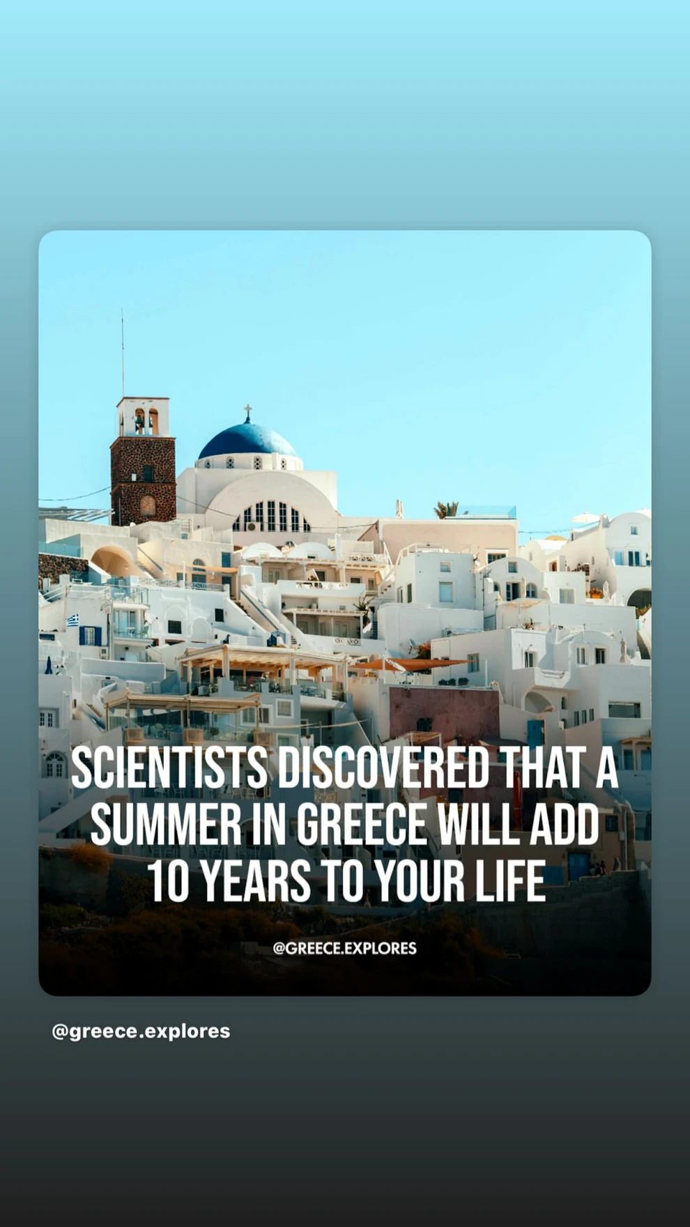 Ειδικότερα, η πρώτη φωτογραφία δείχνει ένα ελληνικό με τη λεζάντα «οι επιστήμονες ανακάλυψαν ότι ένα καλοκαίρι στην Ελλάδα δίνει στη ζωή σου επιπλέον 10 χρόνια».