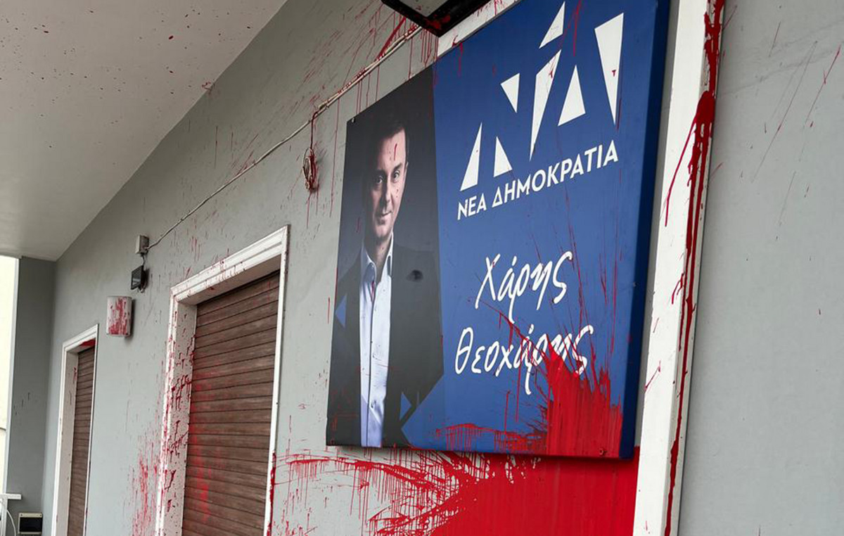 Επίθεση δέχτηκε χθες το βράδυ το γραφείο του βουλευτή Β3 Νοτίου Τομέα Αθηνών, Χάρη Θεοχάρη. Άγνωστοι πέταξαν μπογιές και έγραψαν συνθήματα στην πρόσοψή του γραφείου του.