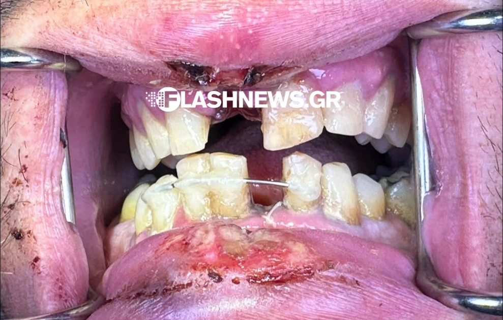 Ο τραυματισμός στο στόμα του είναι σοκαριστικός, ενώ, όπως αναφέρει ο οδοντίατρος που επισκέφτηκε ο άνδρας μετά το ατύχημα, «από καθαρή τύχη δεν τραυματίστηκε το παιδί του».