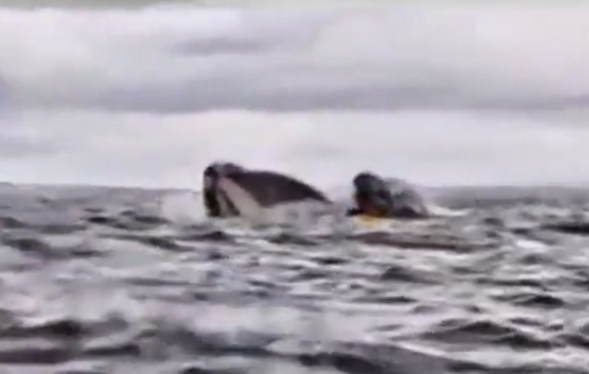 Το βίντεο, το οποίο διαδόθηκε ευρέως στα μέσα κοινωνικής δικτύωσης, δείχνει τη στιγμή που ο 24χρονος Adrian Simancas εξαφανίζεται μπροστά στα μάτια του πατέρα του, Dell, καθώς οι δυο τους έκαναν καγιάκ σε ταραγμένα νερά. Η τεράστια φάλαινα αναδύθηκε ξαφνικά από το νερό, ανοίγοντας το πελώριο στόμα της και φάνηκε να καταπίνει τον νεαρό μαζί με το φουσκωτό του καγιάκ, προτού εκείνος εμφανιστεί ξανά.