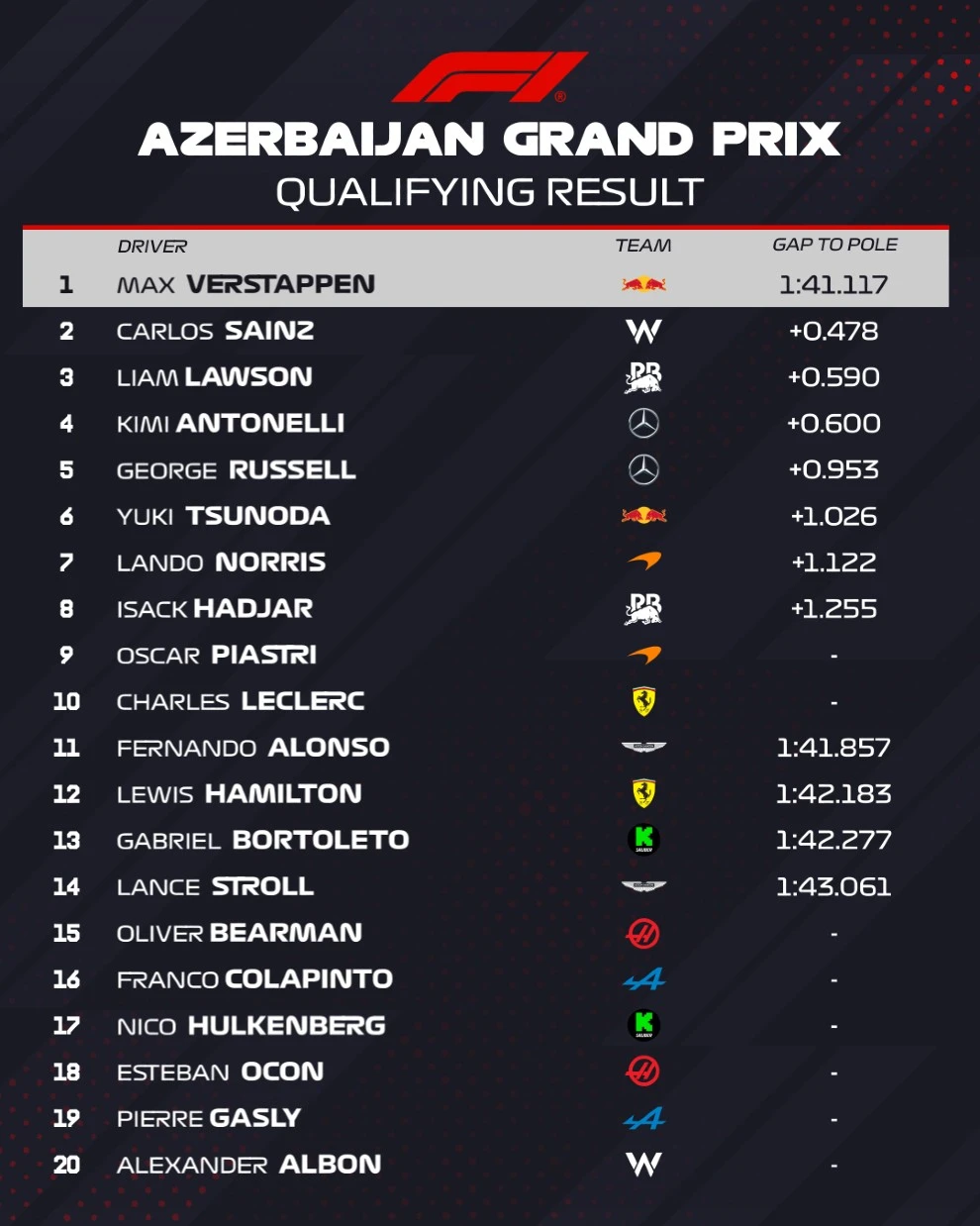 Από εκεί και πέρα, από την 6η θέση θα ξεκινήσει τον αγώνα ο Γιούκι Τσουνόντα, στην 7η θα είναι ο Λάντος Νόρις, στην 8η ο Ισάκ Χαντζάρ, στην 9η ο Όσκαρ Πιάστρι και στη 10η ο Σαρλ Λεκλέρ, με τη Ferrari να απογοητεύει ξανά καθώς ο έτερος οδηγός της, ο Λιούις Χάμιλτον, θα ξεκινήσει από τη 12η θέση.