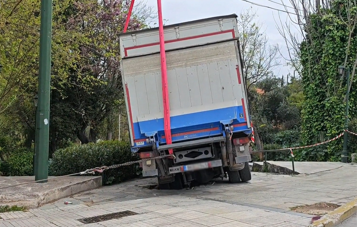 Το φορτηγό απομακρύνεται με τη βοήθεια ενός ειδικού γερανού, ενώ στο σημείο αναμένεται ειδικό συνεργείο για να σηματοδοτήσει και να αποκλείσει την πρόσβαση στην τρύπα.