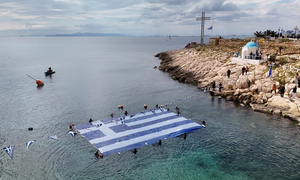 Στις 12:00 ακριβώς, στον Όρμο της Αφροδίτης (το γνωστό «Μπαϊκούτσι»), μέλη του Συνδέσμου Ελλήνων Βατραχανθρώπων βούτηξαν στα νερά για να απλώσουν μια τεράστια ελληνική σημαία στην επιφάνεια της θάλασσας.