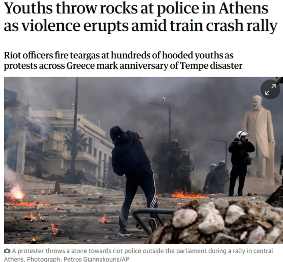 Εκτεταμένες συγκρούσεις μεταξύ νεαρών διαδηλωτών και αστυνομικών δυνάμεων σημειώθηκαν στο κέντρο της Αθήνας, επισκιάζοντας τις ειρηνικές πορείες που πραγματοποιήθηκαν για τη δεύτερη επέτειο του πολύνεκρου σιδηροδρομικού δυστυχήματος στα Τέμπη, αναφέρει σε ανταπόκρισή του ο βρετανικός Guardian.
