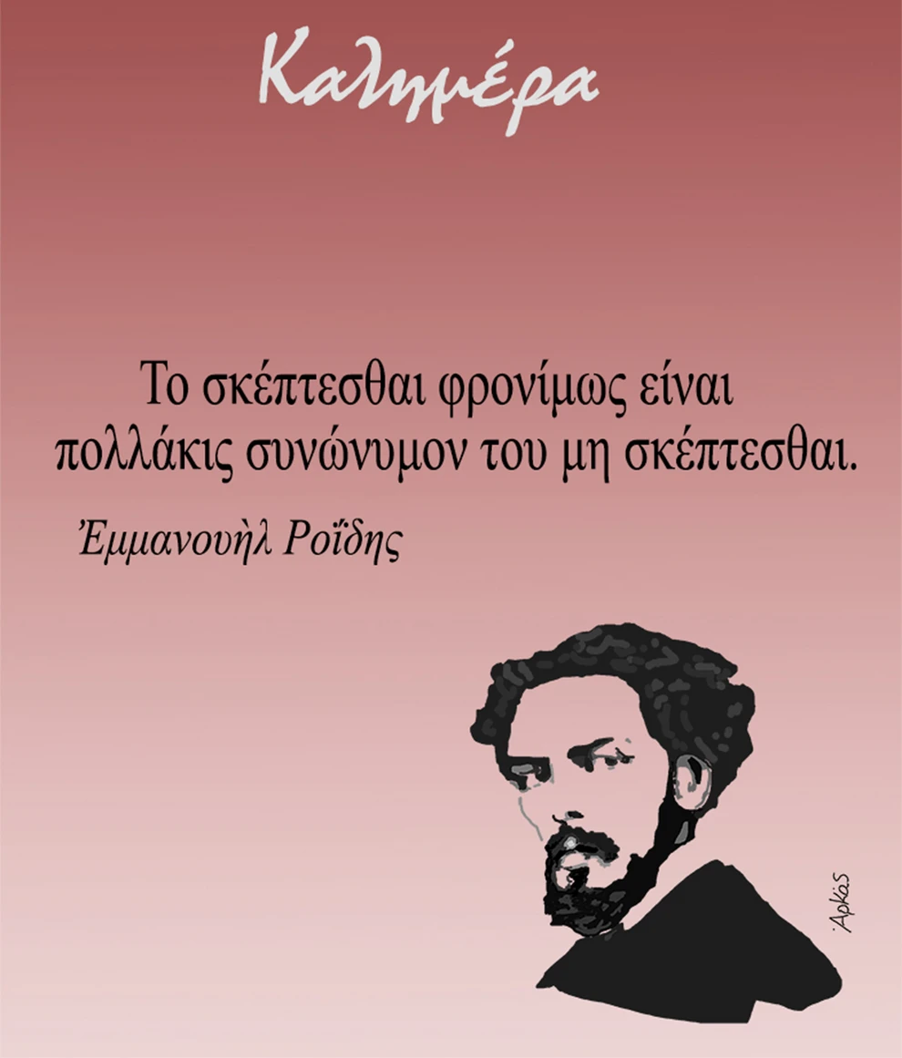 Στο σημερινό σκίτσο βλέπουμε μια προσωπογραφία του λογοτέχνη και δοκιμιογράφου Εμμανουήλ Ροΐδη να λέει: «Το σκέπτεσθαι φρονίμως είναι πολλάκις συνώνυμον του μη σκέπτεσθαι».