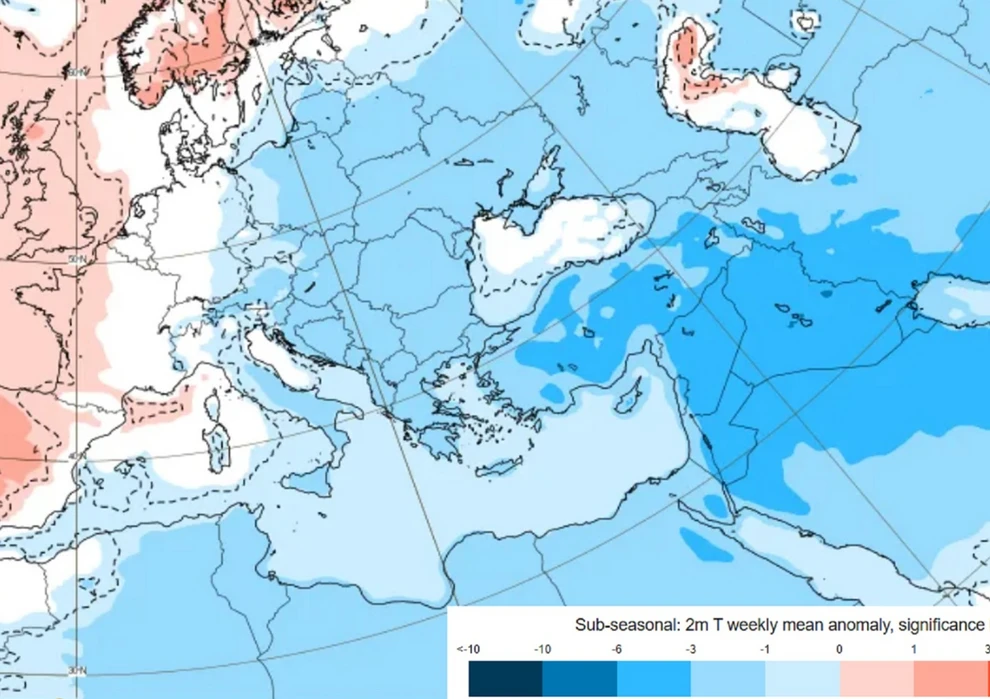 Όπως αναφέρει ο Γιάννης Καλλιάνος, με βάση τον χάρτη θερμοκρασιακών αποκλίσεων σε εβδομαδιαία βάση, η Ελλάδα φαίνεται να βρίσκεται σε γαλάζιες αποχρώσεις. Αυτό μεταφράζεται σε θερμοκρασίες που αναμένεται να κινηθούν κάτω από τα φυσιολογικά επίπεδα για την εποχή, περίπου κατά 1 έως 3 βαθμούς Κελσίου.