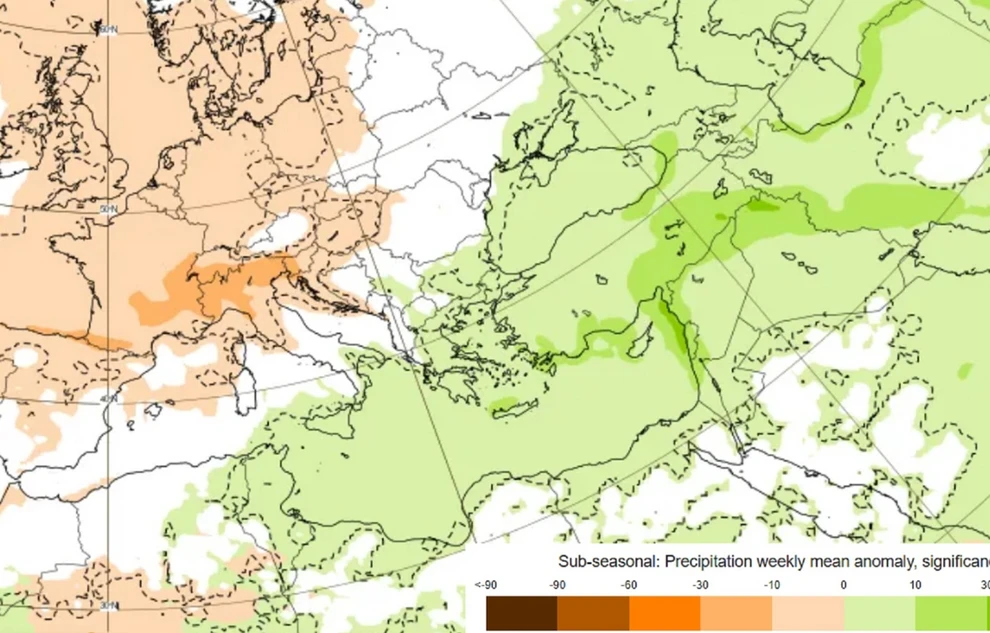 Την ίδια ώρα, μεγάλο μέρος της Δυτικής και Βόρειας Ευρώπης εμφανίζει αρνητικές αποκλίσεις στον υετό, κάτι που υποδηλώνει πιο ξηρές συνθήκες σε σχέση με τα κανονικά δεδομένα για τις συγκεκριμένες περιοχές. Όπως διευκρινίζει ο μετεωρολόγος, αυτό δεν σημαίνει ότι χώρες όπως η Μεγάλη Βρετανία θα έχουν λιγότερες βροχές από την Ελλάδα, αλλά ότι θα καταγράψουν λιγότερες βροχοπτώσεις σε σύγκριση με τον δικό τους μέσο όρο για την ίδια περίοδο.