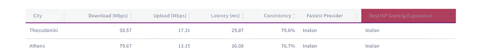 Ενδεικτικά, στην Αθήνα η INALAN παρουσίασε διάμεση ταχύτητα download 79,67 Mbps με latency 16,08 ms, επιβεβαιώνοντας την υπεροχή της INALAN έναντι όλων των άλλων παρόχων στις συγκεκριμένες περιοχές μέτρησης. Η πρωτιά της INALAN καταγράφηκε στις περιοχές όπου διαθέτει γεωγραφική κάλυψη, επιβεβαιώνοντας την απόδοση του FTTH δικτύου της εκεί όπου λειτουργεί.