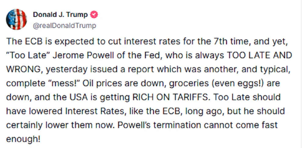 «Η ΕΚΤ αναμένεται να μειώσει τα επιτόκια για 7η φορά, κι όμως, “πολύ καθυστερημένα” ο Τζερόμ Πάουελ της Fed, ο οποίος πάντα ΚΑΘΥΣΤΕΡΕΙ ΠΟΛΥ ΚΑΙ ΛΑΘΟΣ, εξέδωσε χθες μια έκθεση που ήταν άλλο ένα, και τυπικό, πλήρες “χάλι”! Οι τιμές του πετρελαίου έχουν πέσει, τα είδη διατροφής (ακόμα και τα αυγά!) έχουν πέσει, και οι ΗΠΑ πλουτίζουν από τους δασμούς. Πολύ αργά θα έπρεπε να έχει μειώσει τα επιτόκια, όπως η ΕΚΤ, εδώ και πολύ καιρό, αλλά σίγουρα θα έπρεπε να τα μειώσει τώρα. Η λήξη της θητείας του Πάουελ δεν μπορεί να έρθει αρκετά γρήγορα!».