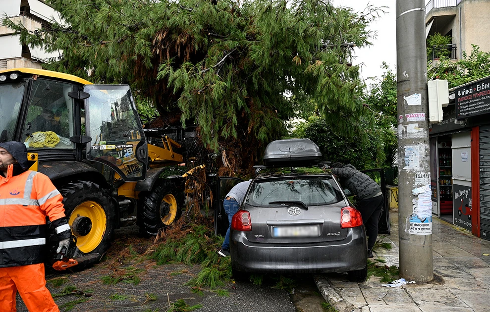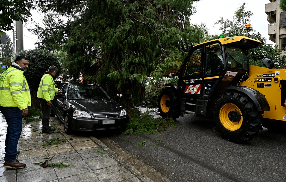 Το τζάμι του οχήματος καταστράφηκε, ενώ η πυροσβεστική κλήθηκε άμεσα για την κοπή του δέντρου.